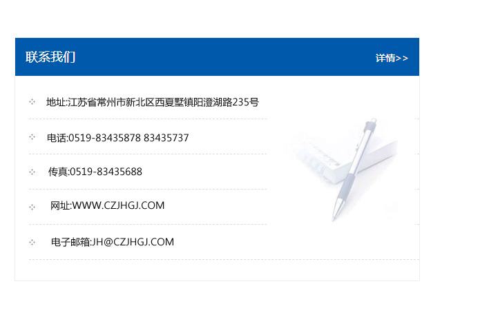 地址:常州市新北區友邦商務大廈1幢16、17層  電話:0519-85101652  傳真:0519-85112595  郵編:213022  網址:www.cz-jiayue_cn.wenanjob.com  郵箱:xiajifengaa@163.com